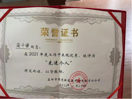 2021年度工作中我還有幸獲得了先進個人的稱號。薄薄的一張獎狀,上面卻承載著公司對我寄予的厚重期望。我深知這是公司對我的認可與信任。這讓我明白了我所付出的努力都是值得的,都被公司的領導們和同事們看在眼里,想在心里。我將這份感激銘記于心,但我不會止步于此,我要讓越來越多的人看到我的努力、讓越來越多的人認可我,我將以此為契機繼續努力奮斗,創造更好的成績!未來的日子,我將肩負起屬于我的這份責任,以城投為家,與城投共成長!