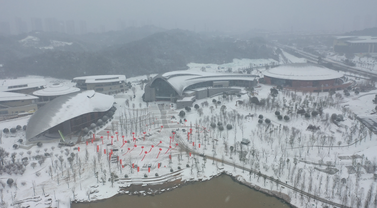 “一園兩中心”由梓山湖生態公園、益陽市民文化中心、益陽市民服務中心組成。其中,益陽市民文化中心和益陽市民服務中心秉承本土化、生態化設計理念,以洞庭漁歌為主題,沿山脊呈線性分布,旨在延續梓山湖南岸的山水脈絡。建筑單體在形態意向上取自“一群魚”的理念,彰顯“洞庭漁歌”的湖區傳統特征文化。凸顯益陽“魚米之鄉”的吉祥寓意。